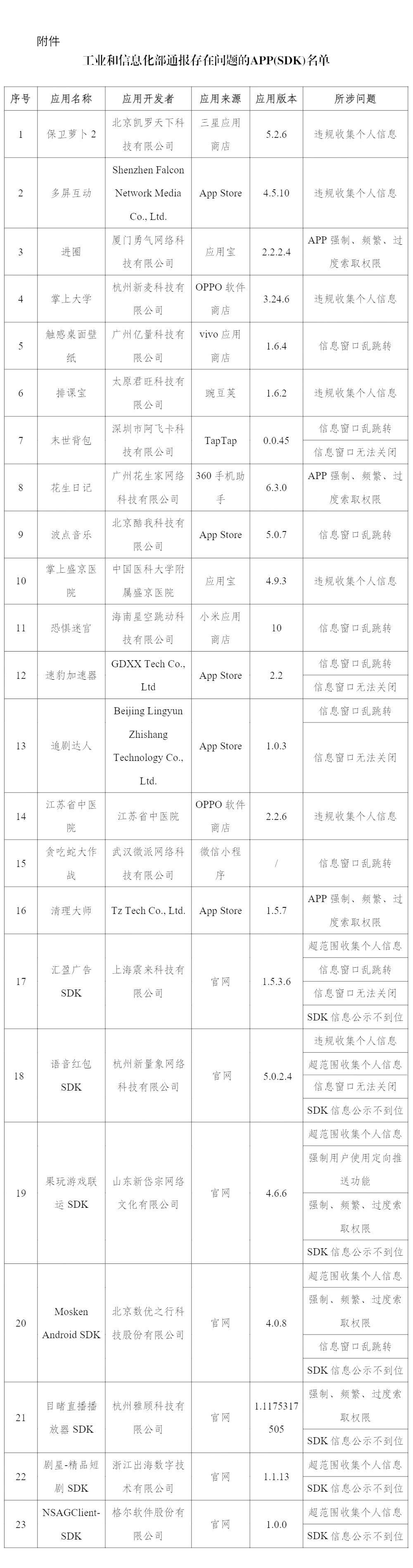 記者8月4日從工業(yè)和信息化部獲悉,依據(jù)相關(guān)法律法規(guī),工業(yè)和信息化部對APP、SDK(第三方軟件開發(fā)工具包)違法違規(guī)收集使用個人信息等問題開展治理。近期,經(jīng)組織第三方檢測機構(gòu)進行抽查,共發(fā)現(xiàn)23款A(yù)PP及SDK存在侵害用戶權(quán)益行為。