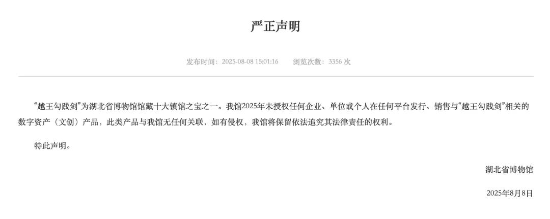8月8日下午,湖北省博物館發(fā)布嚴(yán)正聲明稱(chēng):“越王勾踐劍”為湖北省博物館館藏十大鎮(zhèn)館之寶之一。我館2025年未授權(quán)任何企業(yè)、單位或個(gè)人在任何平臺(tái)發(fā)行、銷(xiāo)售與“越王勾踐劍”相關(guān)的數(shù)字資產(chǎn)(文創(chuàng))產(chǎn)品,此類(lèi)產(chǎn)品與我館無(wú)任何關(guān)聯(lián),如有侵權(quán),我館將保留依法追究其法律責(zé)任的權(quán)利。