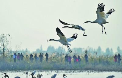 人們在江西鄱陽湖畔鯉魚洲觀察拍攝白鶴。新華社發(fā)