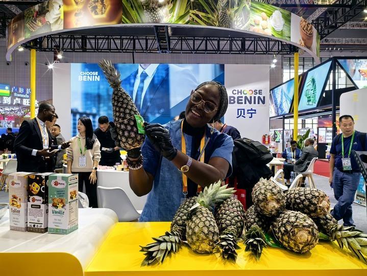 2024年11月7日,在上海舉行的第七屆中國(guó)國(guó)際進(jìn)口博覽會(huì)上,貝寧國(guó)家館工作人員展示本國(guó)特色農(nóng)產(chǎn)品——貝寧菠蘿。新華社記者 郝王樂(lè) 攝