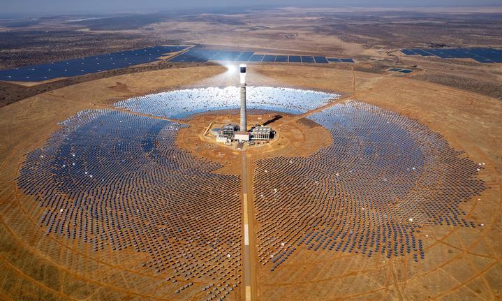 這是2024年8月20日在南非北開(kāi)普省拍攝的由中國(guó)電建集團(tuán)山東電建三公司承建的南非紅石100兆瓦塔式熔鹽光熱電站項(xiàng)目(無(wú)人機(jī)照片)。新華社記者 張譽(yù)東 攝