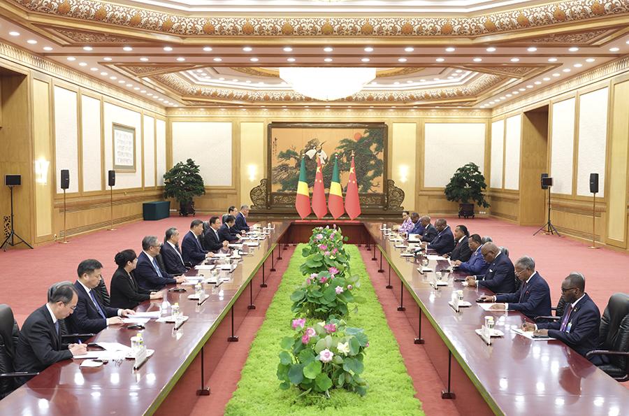 9月4日中午,國(guó)家主席習(xí)近平在北京人民大會(huì)堂會(huì)見(jiàn)來(lái)華出席紀(jì)念中國(guó)人民抗日戰(zhàn)爭(zhēng)暨世界反法西斯戰(zhàn)爭(zhēng)勝利80周年活動(dòng)的剛果(布)總統(tǒng)薩蘇。