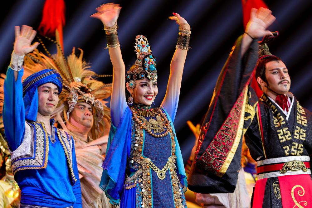 2022年4月22日,在新疆藝術(shù)劇院木卡姆藝術(shù)團(tuán)劇場(chǎng),舞蹈演員馬依熱·艾買提江(中)在舞劇《張騫》演出后向觀眾致謝。馬依熱來自烏魯木齊,11歲時(shí)前往北京跟隨專業(yè)舞蹈老師學(xué)習(xí),學(xué)成后回到家鄉(xiāng),成為新疆藝術(shù)劇院歌舞團(tuán)的一名舞蹈演員?!靶陆母栉枋侵腥A傳統(tǒng)文化的一部分,是用來歌頌美好生活的。希望我的舞蹈,能增進(jìn)各民族間的感情,促進(jìn)文化交融?!瘪R依熱說。