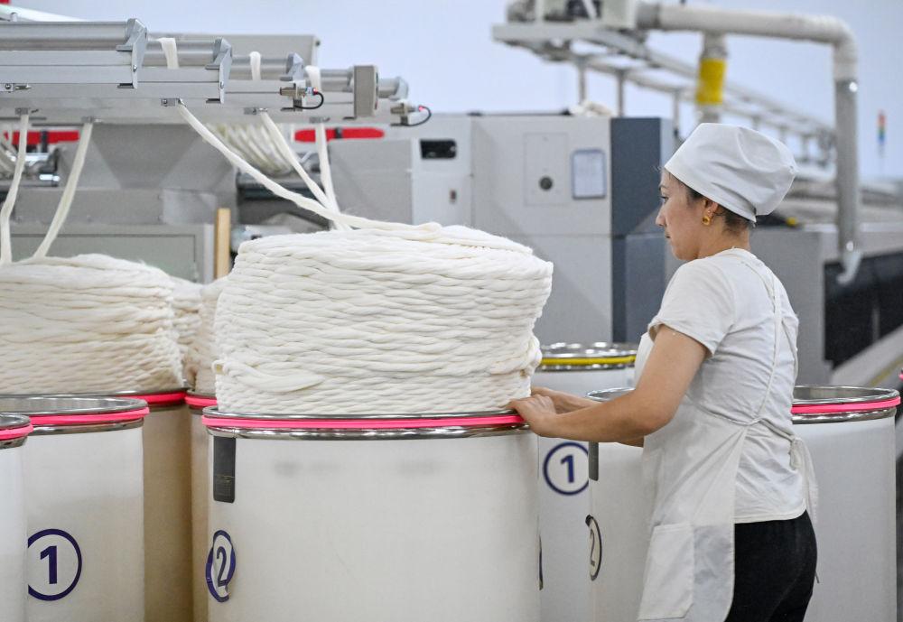 2024年7月4日,新疆克孜勒蘇柯爾克孜自治州一家紡織企業(yè)的工人在紡紗車間工作。棉花和紡織服裝產(chǎn)業(yè)已成為新疆重要的民生產(chǎn)業(yè)和支柱產(chǎn)業(yè)。近年來,克孜勒蘇柯爾克孜自治州阿圖什市以棉紡織業(yè)為引領(lǐng),積極招商引資,打造集紡紗、織布以及高端紡織品研發(fā)為一體的大型紡織產(chǎn)業(yè)園區(qū),為周邊鄉(xiāng)鎮(zhèn)群眾提供1500余個(gè)就業(yè)崗位。