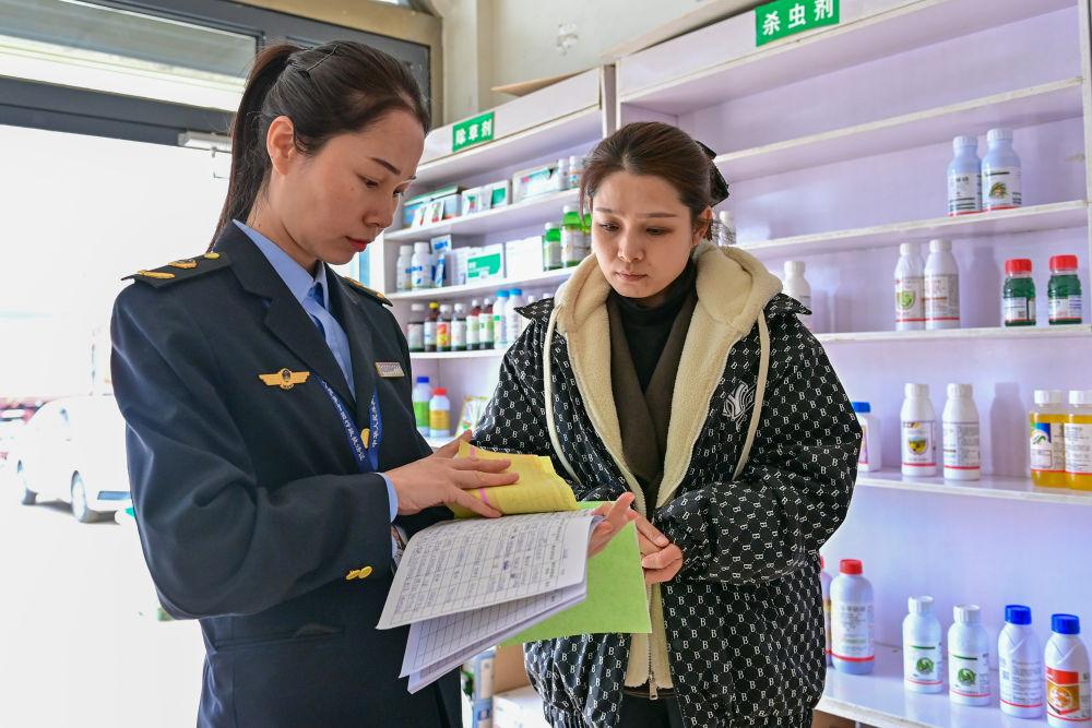 2024年3月21日,新疆阿克蘇市農(nóng)業(yè)綜合行政執(zhí)法大隊(duì)的執(zhí)法人員在阿克蘇市農(nóng)資市場(chǎng)查看農(nóng)資經(jīng)銷部的銷售臺(tái)賬。