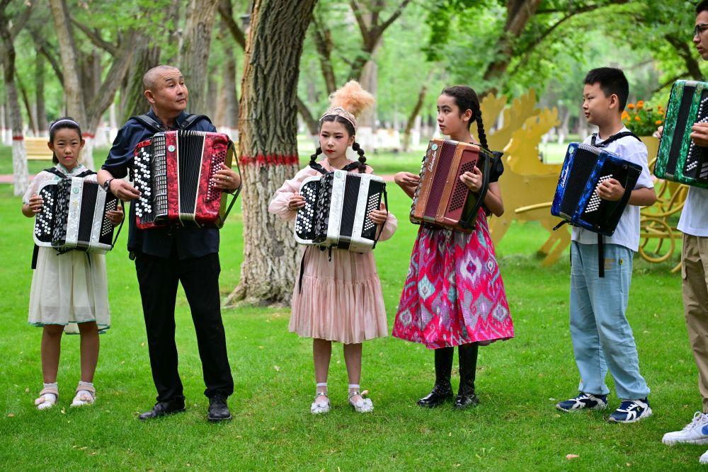 2024年7月24日,在新疆塔城市文化廣場(chǎng),手風(fēng)琴文化傳承中心老師道吾然·對(duì)山漢(左二)帶領(lǐng)學(xué)生練習(xí)手風(fēng)琴。塔城市居住著漢族、哈薩克族、回族、維吾爾族、蒙古族、塔塔爾族、俄羅斯族等20多個(gè)民族,是一片多元文化沃土。手風(fēng)琴是塔城市民間最廣為流傳的樂器,也是各族人民文化交流的重要媒介。近年來,塔城市深入挖掘手風(fēng)琴文化,舉辦多場(chǎng)手風(fēng)琴文化藝術(shù)節(jié)活動(dòng),為各民族文化交流提供平臺(tái)。