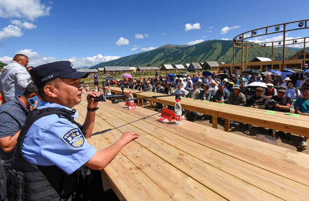 2024年7月22日,在新疆阿勒泰地區(qū)布爾津縣禾木哈納斯蒙古族鄉(xiāng)哈納斯村,喀納斯邊境派出所民警在村民大會(huì)上給村民宣講邊境法律法規(guī)。近年來,喀納斯邊境派出所通過“警村企黨支部聯(lián)合工作站”模式,聯(lián)合當(dāng)?shù)厝罕?、景區(qū)一起解決游客難題,大大提升了警務(wù)效率,逐步形成了“景中警 貼心人”的旅游警務(wù)品牌。