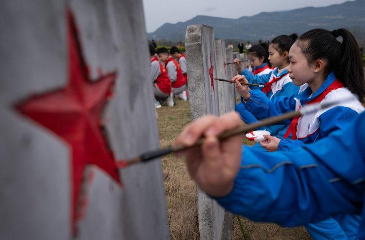 2025年3月31日,在四川川陜革命根據(jù)地紅軍烈士陵園,紅軍小學學生為無名烈士墓碑上的五角星描紅。當日,來自四川通江縣的300名中小學青少年代表,齊聚川陜革命根據(jù)地紅軍烈士陵園,在莊嚴肅穆的儀式中開啟了一堂“紀念碑下的思政課”,為埋葬在這里的25048名紅軍烈士寄去哀思。