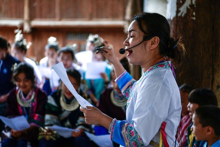 隨著國產(chǎn)動畫電影《哪吒之魔童鬧海》不斷刷新中國影史票房紀錄,參與電影配樂的貴州省榕江縣三寶侗寨的楊想妮和“舞樂蟬歌”團隊為更多人所熟知。樂團成員懷揣“用音樂傳遞侗族文化,讓世界聽見侗族大歌”的共同夢想,將侗族大歌推向更廣闊的舞臺。這是2025年4月22日,楊想妮在貴州省黎平縣肇興鎮(zhèn)廈格侗寨教前來研學的孩子們唱侗歌。
