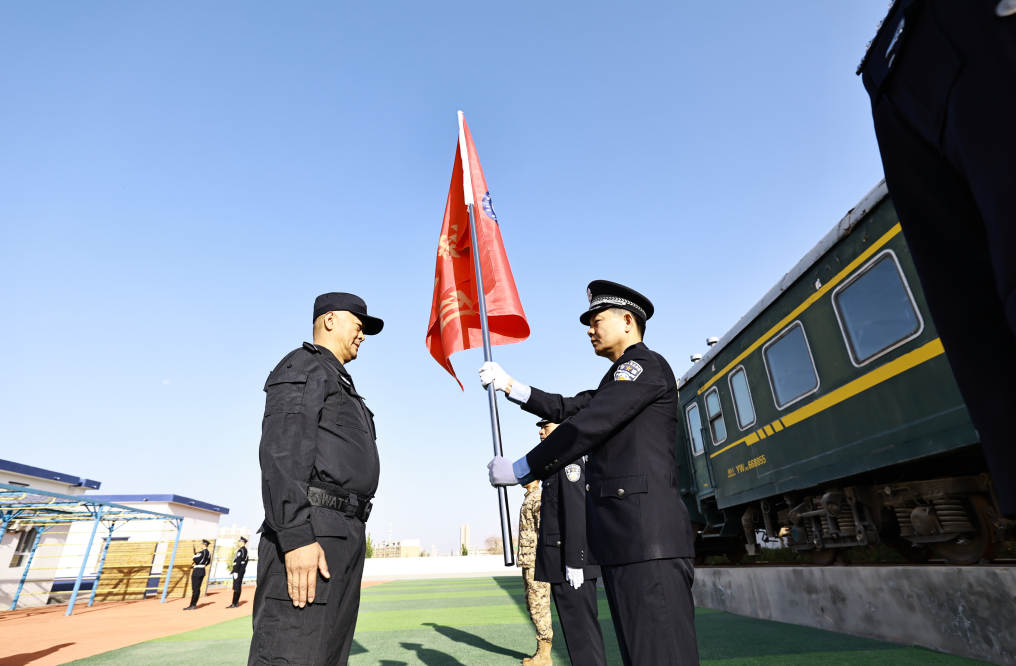圖為10月10日,烏魯木齊鐵路公安局庫(kù)爾勒公安處特警支隊(duì)授旗儀式現(xiàn)場(chǎng)。