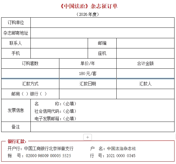 ★若不能進(jìn)行在線提交訂單,請將本征訂單填寫完整后與匯款憑證一并發(fā)郵件至zgfzfxb@moj.gov.cn;或添加微信13671053926后發(fā)送電子版征訂單與匯款憑證。