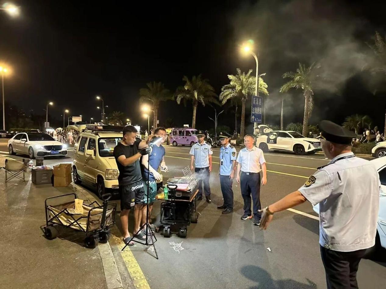 為進(jìn)一步規(guī)范管理流動攤販占道經(jīng)營秩序,消除道路交通安全隱患,針對西海岸片區(qū)占道經(jīng)營以及夜間露天燒烤及出店經(jīng)營等問題,城市管理行政執(zhí)法大隊(duì)、海秀街道辦綜合行政執(zhí)法中隊(duì)、長流鎮(zhèn)綜合行政執(zhí)法中隊(duì)、西秀鎮(zhèn)綜合行政執(zhí)法中隊(duì)在西海岸周邊區(qū)域,集中開展夜間執(zhí)法檢查。