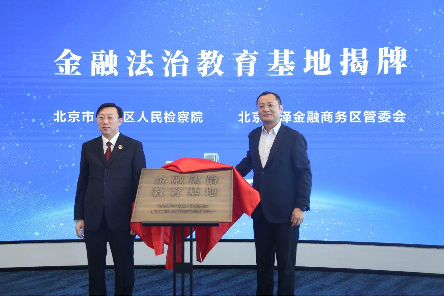 圖為北京豐臺(tái)區(qū)人民檢察院檢察長(zhǎng)劉澤鋒與麗澤金融商務(wù)區(qū)管委會(huì)主任李聲為金融法治教育基地揭牌。