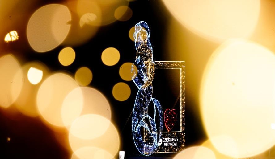 12月16日,波蘭華沙點(diǎn)亮彩燈,向抗擊新冠疫情的醫(yī)務(wù)人員表示感謝。這處彩燈左側(cè)的美人魚(yú)為華沙的象征,右側(cè)有“感謝醫(yī)務(wù)人員”的字樣。
