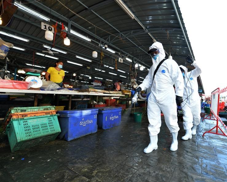 12月21日,防疫人員在泰國沙沒沙空府一個市場進行消殺工作。