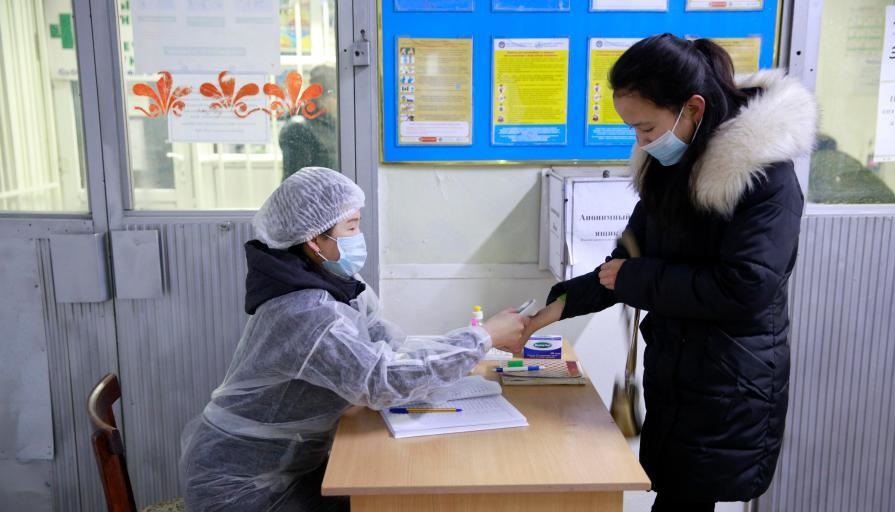 12月23日,在吉爾吉斯斯坦比什凱克,一名市民(右)到一家醫(yī)藥中心問(wèn)診時(shí)接受體溫檢測(cè)。