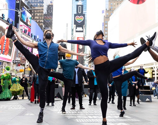 人民網(wǎng)訊 當(dāng)?shù)貢r間2021年3月12日,美國紐約,百老匯劇院關(guān)閉一周年,美國戲劇界在時代廣場組織了一場名為“我們會回來的”的快閃演出。
