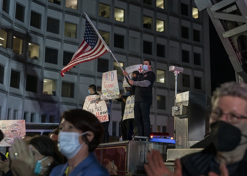 人民網(wǎng)訊 當(dāng)?shù)貢r間2021年3月11日,美國紐約州基斯科山,在世衛(wèi)組織宣布新冠肺炎為大流行病一周年之際,民眾在醫(yī)院外參加新冠疫情暴發(fā)一周年紀(jì)念日活動,致謝抗疫醫(yī)護人員、消防員和警察。