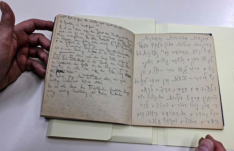 人民網(wǎng)訊 當(dāng)?shù)貢r(shí)間5月31日,耶路撒冷地區(qū),以色列國家圖書館的博士修復(fù)并首次展示了捷克德語小說家弗朗茨·卡夫卡用希伯來文(右)和德語(左)所寫的原稿。