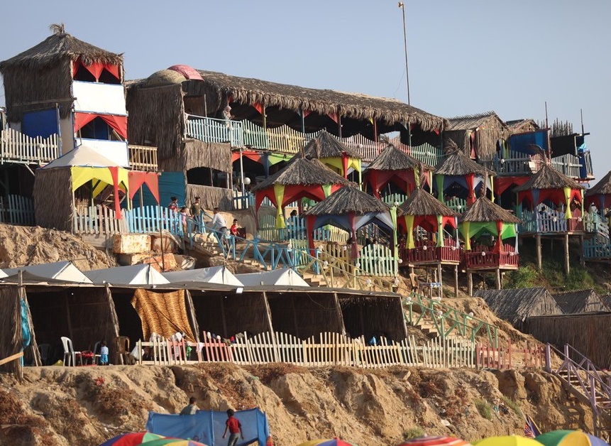 人民網(wǎng)訊 當(dāng)?shù)貢r(shí)間2021年6月25日,巴勒斯坦Deir al-Balah,當(dāng)?shù)鼐用裥∧疚葜懈╊刂泻:?,樂享夏日時(shí)光。海灘是這個(gè)城市為數(shù)不多開放的公共空間之一。