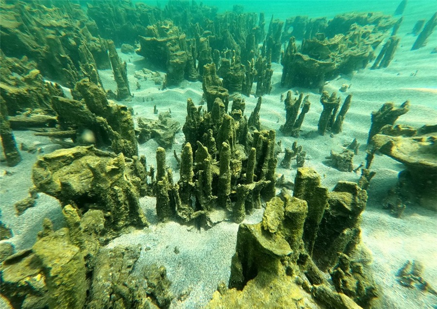 人民網(wǎng)訊 當?shù)貢r間8月8日,土耳其比特利斯省,凡湖水下發(fā)現(xiàn)新微生物巖。