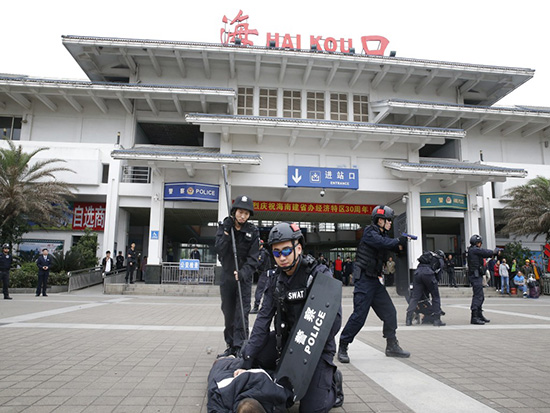 海口鐵路公安處??谡九沙鏊e行反恐演練。張新新 攝