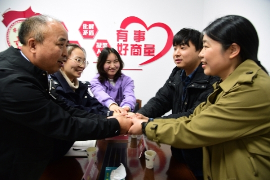 11月23日,山東省棗莊市市中區(qū)司法局龍山路司法所工作人員和人民調(diào)解員正在調(diào)解一起因鄰里瑣事引發(fā)的糾紛。 法治日?qǐng)?bào)全媒體通訊員 吉喆 攝