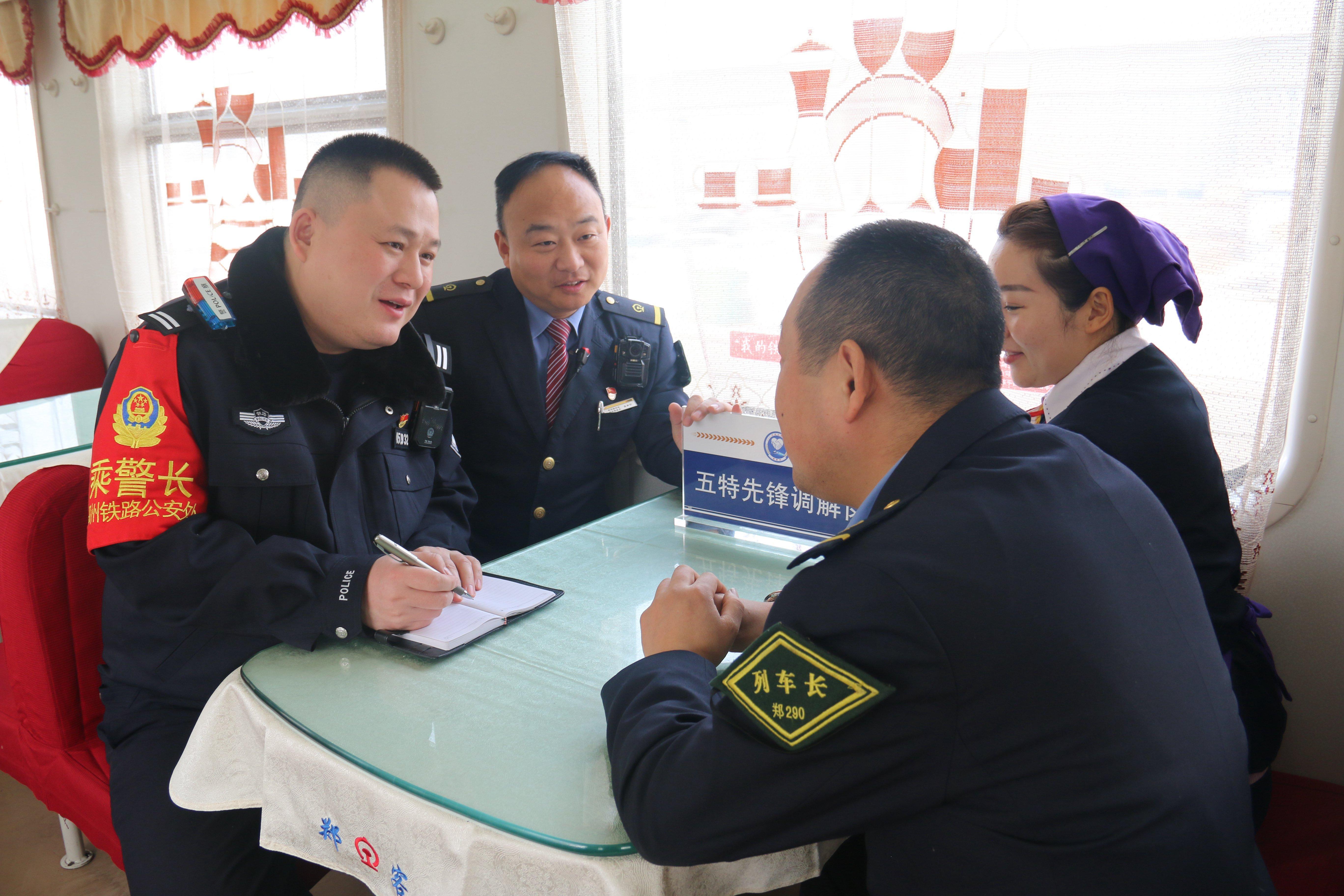圖為乘警長趙宋召集列車工作人員研判列車治安情況,進(jìn)行安全提醒。