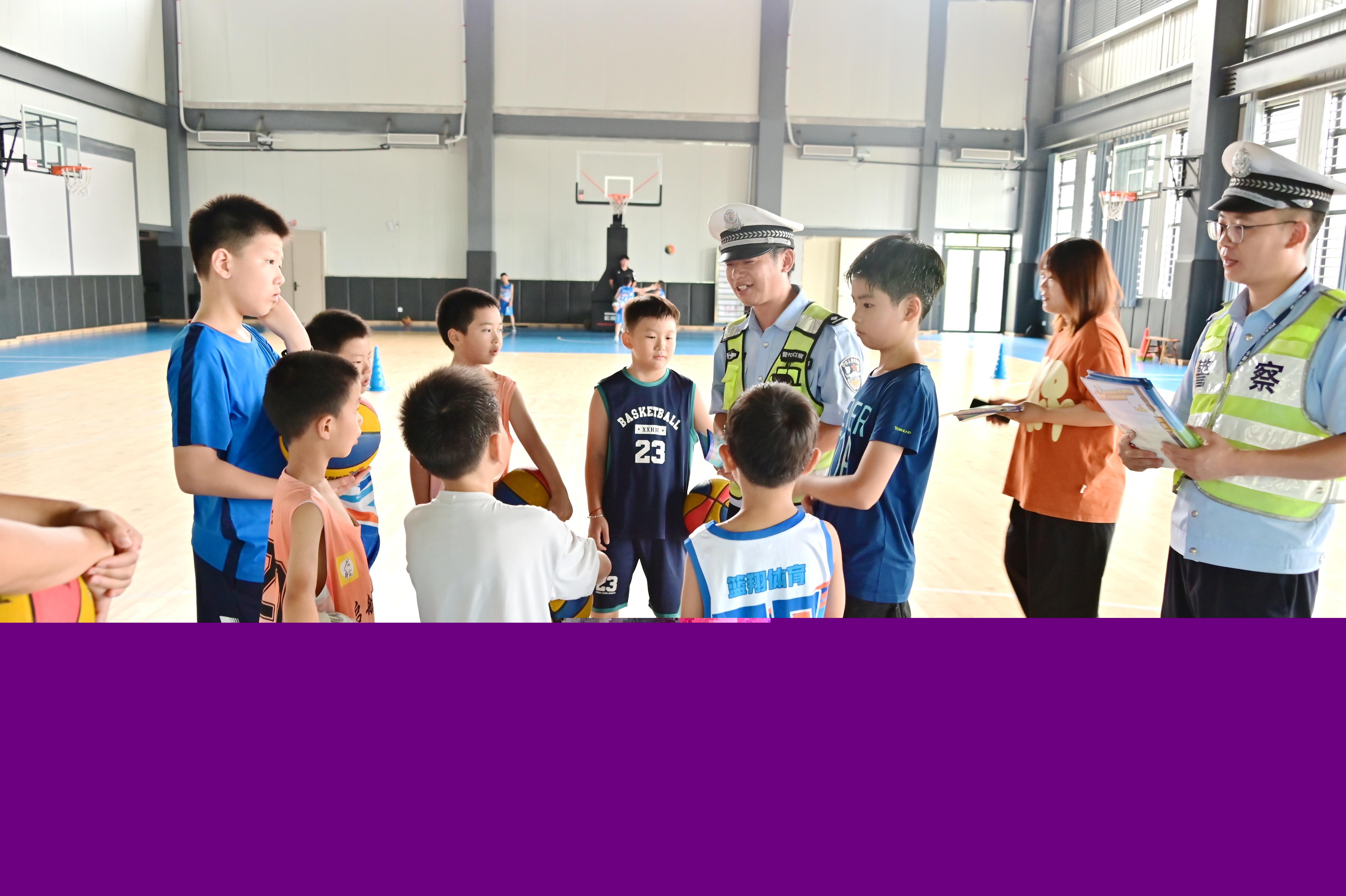 圖為7月23日,民輔警在武寧縣藍(lán)翔球館向小球員們宣傳交通安全知識并進行投籃互動。