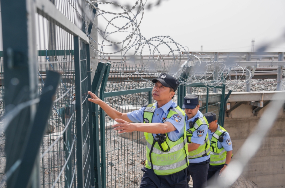 圖9月1日,哈密鐵路公安處紅柳河南站派出所民警對(duì)轄區(qū)線路開(kāi)展隱患排查。