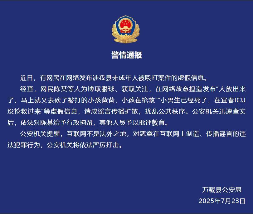 7月23日下午,萬(wàn)載縣公安局發(fā)布警情通報(bào)稱,網(wǎng)民陳某等人為博取眼球、獲取關(guān)注,在網(wǎng)絡(luò)故意捏造發(fā)布“小男生已經(jīng)死了,在宜春ICU沒(méi)搶救過(guò)來(lái)”等虛假信息,公安機(jī)關(guān)依法對(duì)陳某給予行政拘留,其他人員予以批評(píng)教育。