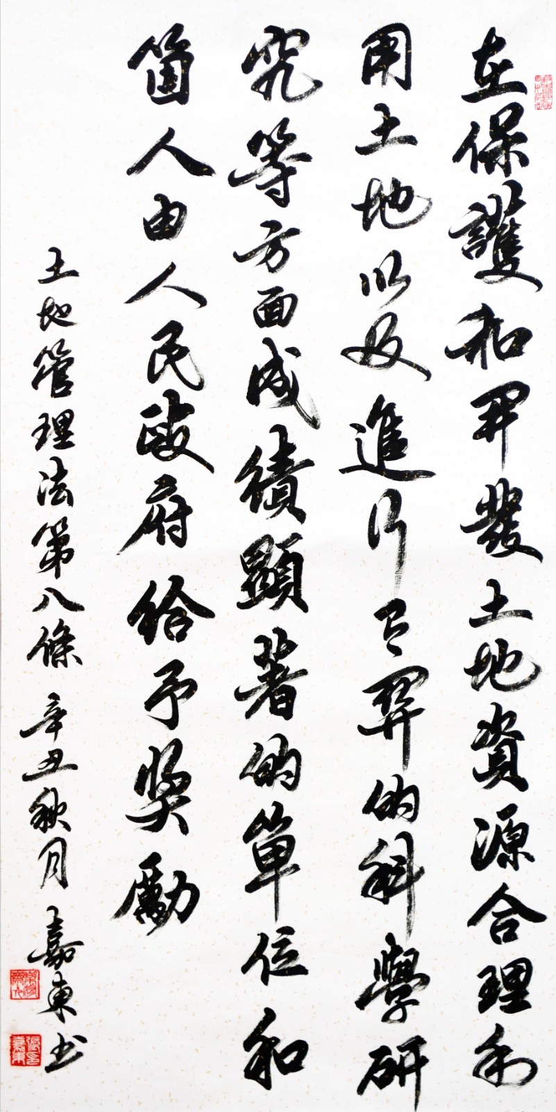 繼1600余位書法家參與書寫《中華人民共和國民法典》全部1260條法條之后,法治日?qǐng)?bào)社聯(lián)合自然資源部法規(guī)司、自然資源部書畫研究會(huì)和北京昌平書法家協(xié)會(huì),將筆端對(duì)準(zhǔn)土地管理“一法一條例”,即《中華人民共和國土地管理法》和《中華人民共和國土地管理法實(shí)施條例》。