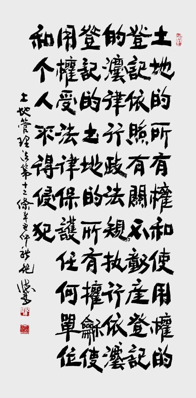 繼1600余位書法家參與書寫《中華人民共和國(guó)民法典》全部1260條法條之后,法治日?qǐng)?bào)社聯(lián)合自然資源部法規(guī)司、自然資源部書畫研究會(huì)和北京昌平書法家協(xié)會(huì),將筆端對(duì)準(zhǔn)土地管理“一法一條例”,即《中華人民共和國(guó)土地管理法》和《中華人民共和國(guó)土地管理法實(shí)施條例》。