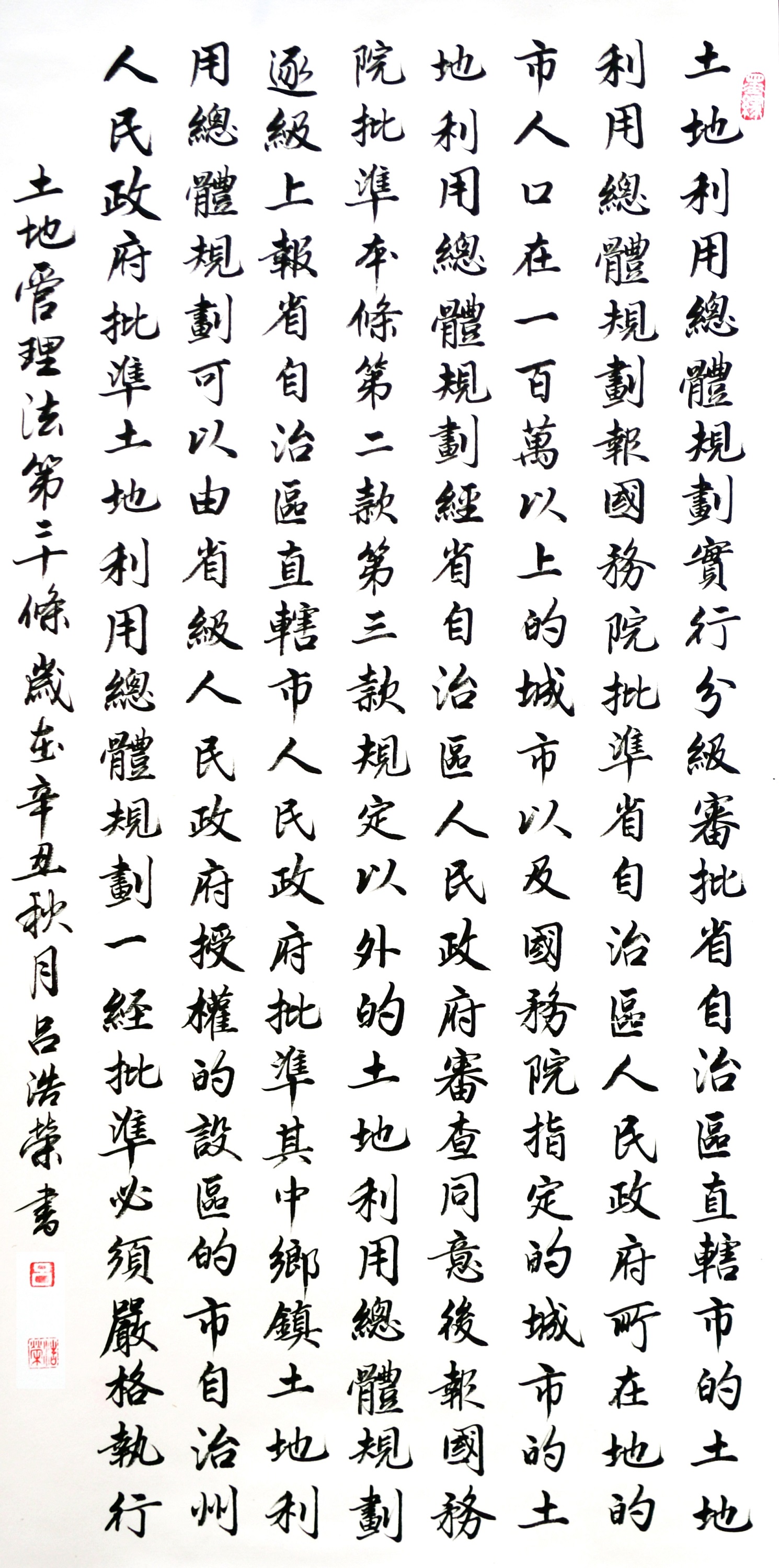 繼1600余位書法家參與書寫《中華人民共和國(guó)民法典》全部1260條法條之后,法治日?qǐng)?bào)社聯(lián)合自然資源部法規(guī)司、自然資源部書畫研究會(huì)和北京昌平書法家協(xié)會(huì),將筆端對(duì)準(zhǔn)土地管理“一法一條例”,即《中華人民共和國(guó)土地管理法》和《中華人民共和國(guó)土地管理法實(shí)施條例》。