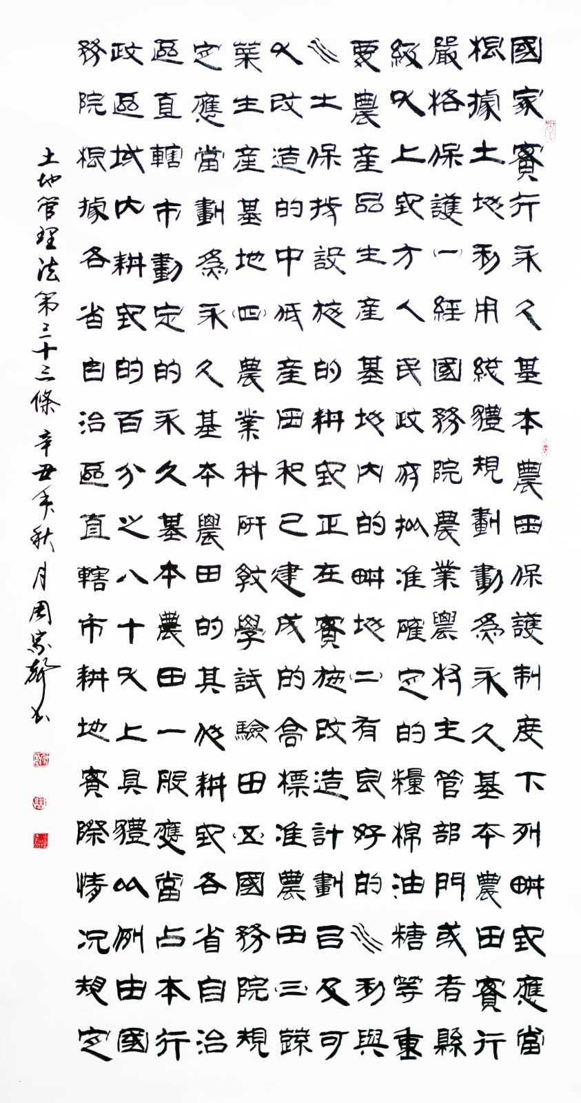 繼1600余位書法家參與書寫《中華人民共和國民法典》全部1260條法條之后,法治日報社聯(lián)合自然資源部法規(guī)司、自然資源部書畫研究會和北京昌平書法家協(xié)會,將筆端對準(zhǔn)土地管理“一法一條例”,即《中華人民共和國土地管理法》和《中華人民共和國土地管理法實施條例》。