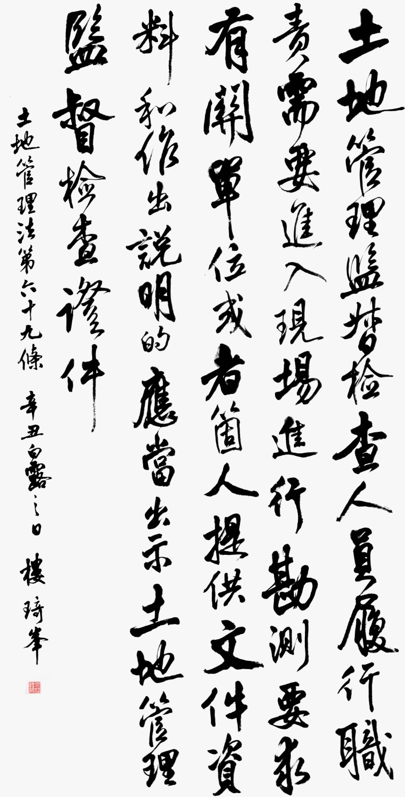 繼1600余位書法家參與書寫《中華人民共和國民法典》全部1260條法條之后,法治日報社聯(lián)合自然資源部法規(guī)司、自然資源部書畫研究會和北京昌平書法家協(xié)會,將筆端對準土地管理“一法一條例”,即《中華人民共和國土地管理法》和《中華人民共和國土地管理法實施條例》。