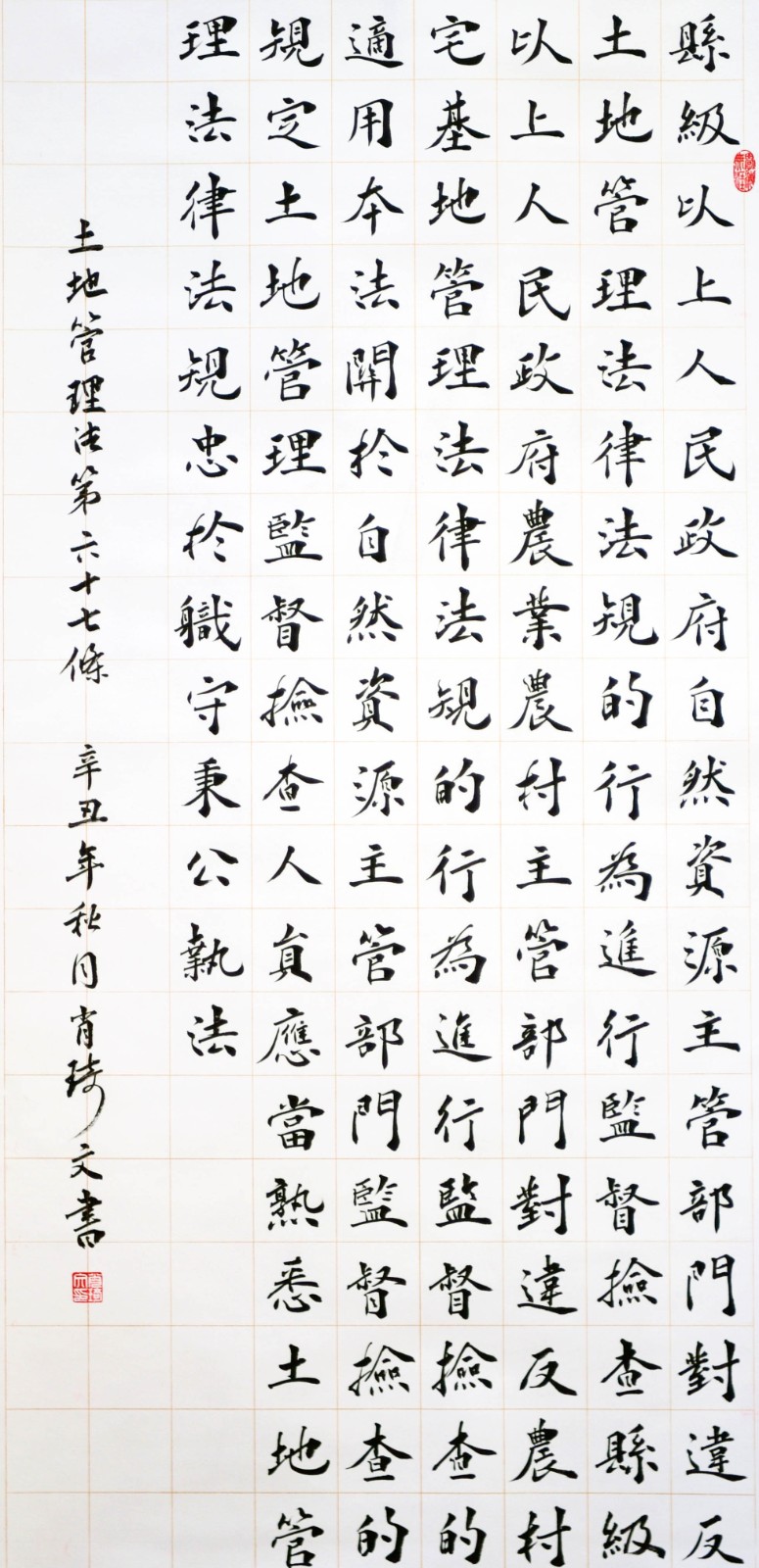繼1600余位書法家參與書寫《中華人民共和國(guó)民法典》全部1260條法條之后,法治日?qǐng)?bào)社聯(lián)合自然資源部法規(guī)司、自然資源部書畫研究會(huì)和北京昌平書法家協(xié)會(huì),將筆端對(duì)準(zhǔn)土地管理“一法一條例”,即《中華人民共和國(guó)土地管理法》和《中華人民共和國(guó)土地管理法實(shí)施條例》。