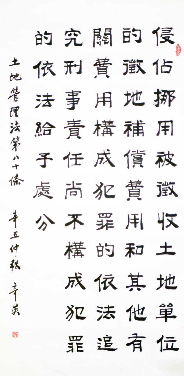繼1600余位書法家參與書寫《中華人民共和國民法典》全部1260條法條之后,法治日報社聯(lián)合自然資源部法規(guī)司、自然資源部書畫研究會和北京昌平書法家協(xié)會,將筆端對準土地管理“一法一條例”,即《中華人民共和國土地管理法》和《中華人民共和國土地管理法實施條例》。