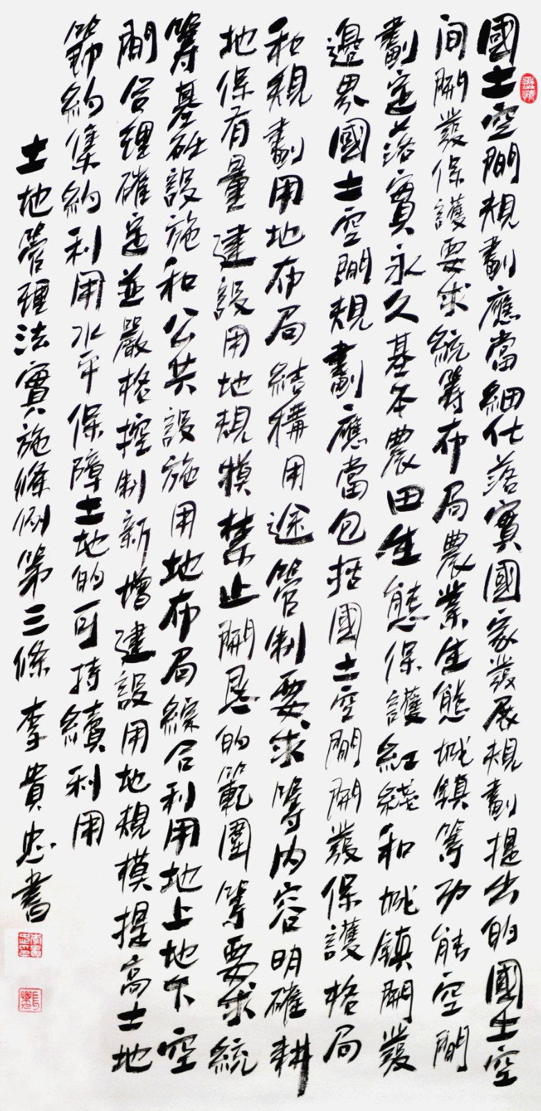 繼1600余位書法家參與書寫《中華人民共和國民法典》全部1260條法條之后,法治日報社聯(lián)合自然資源部法規(guī)司、自然資源部書畫研究會和北京昌平書法家協(xié)會,將筆端對準(zhǔn)土地管理“一法一條例”,即《中華人民共和國土地管理法》和《中華人民共和國土地管理法實施條例》。