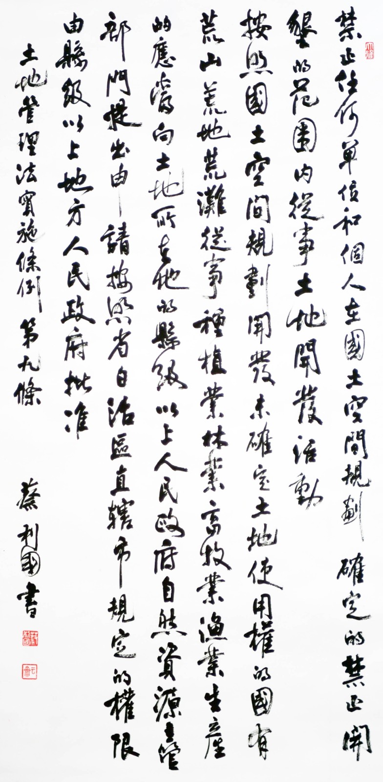 繼1600余位書法家參與書寫《中華人民共和國民法典》全部1260條法條之后,法治日報社聯(lián)合自然資源部法規(guī)司、自然資源部書畫研究會和北京昌平書法家協(xié)會,將筆端對準(zhǔn)土地管理“一法一條例”,即《中華人民共和國土地管理法》和《中華人民共和國土地管理法實施條例》。
