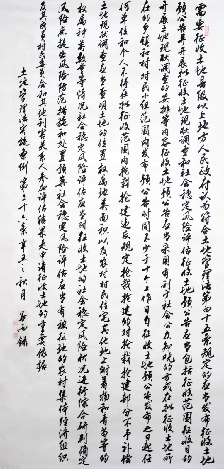 繼1600余位書法家參與書寫《中華人民共和國(guó)民法典》全部1260條法條之后,法治日?qǐng)?bào)社聯(lián)合自然資源部法規(guī)司、自然資源部書畫研究會(huì)和北京昌平書法家協(xié)會(huì),將筆端對(duì)準(zhǔn)土地管理“一法一條例”,即《中華人民共和國(guó)土地管理法》和《中華人民共和國(guó)土地管理法實(shí)施條例》。