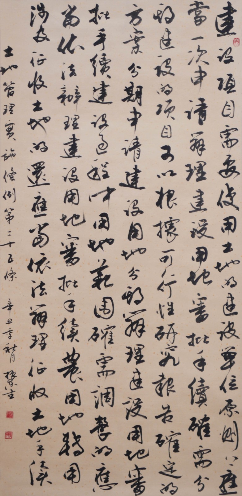 繼1600余位書法家參與書寫《中華人民共和國(guó)民法典》全部1260條法條之后,法治日?qǐng)?bào)社聯(lián)合自然資源部法規(guī)司、自然資源部書畫研究會(huì)和北京昌平書法家協(xié)會(huì),將筆端對(duì)準(zhǔn)土地管理“一法一條例”,即《中華人民共和國(guó)土地管理法》和《中華人民共和國(guó)土地管理法實(shí)施條例》。