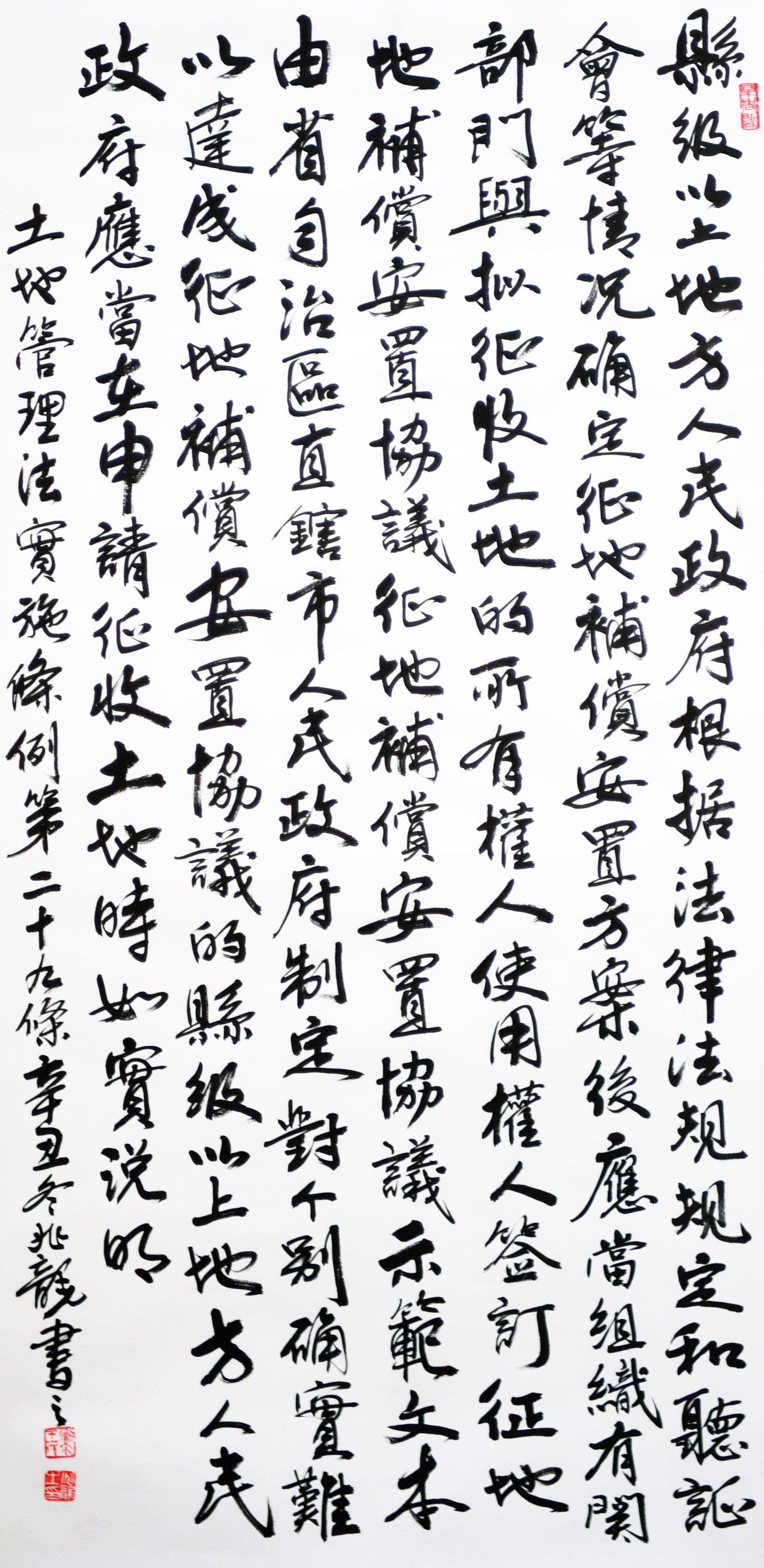 繼1600余位書法家參與書寫《中華人民共和國民法典》全部1260條法條之后,法治日報社聯(lián)合自然資源部法規(guī)司、自然資源部書畫研究會和北京昌平書法家協(xié)會,將筆端對準土地管理“一法一條例”,即《中華人民共和國土地管理法》和《中華人民共和國土地管理法實施條例》。