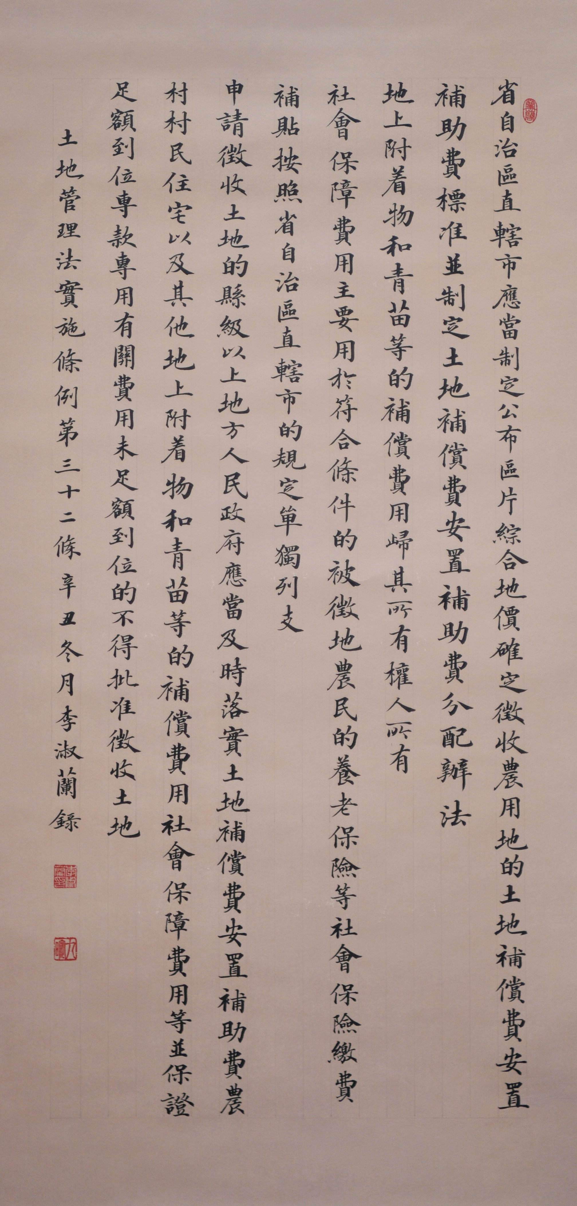 繼1600余位書法家參與書寫《中華人民共和國民法典》全部1260條法條之后,法治日報社聯(lián)合自然資源部法規(guī)司、自然資源部書畫研究會和北京昌平書法家協(xié)會,將筆端對準土地管理“一法一條例”,即《中華人民共和國土地管理法》和《中華人民共和國土地管理法實施條例》。
