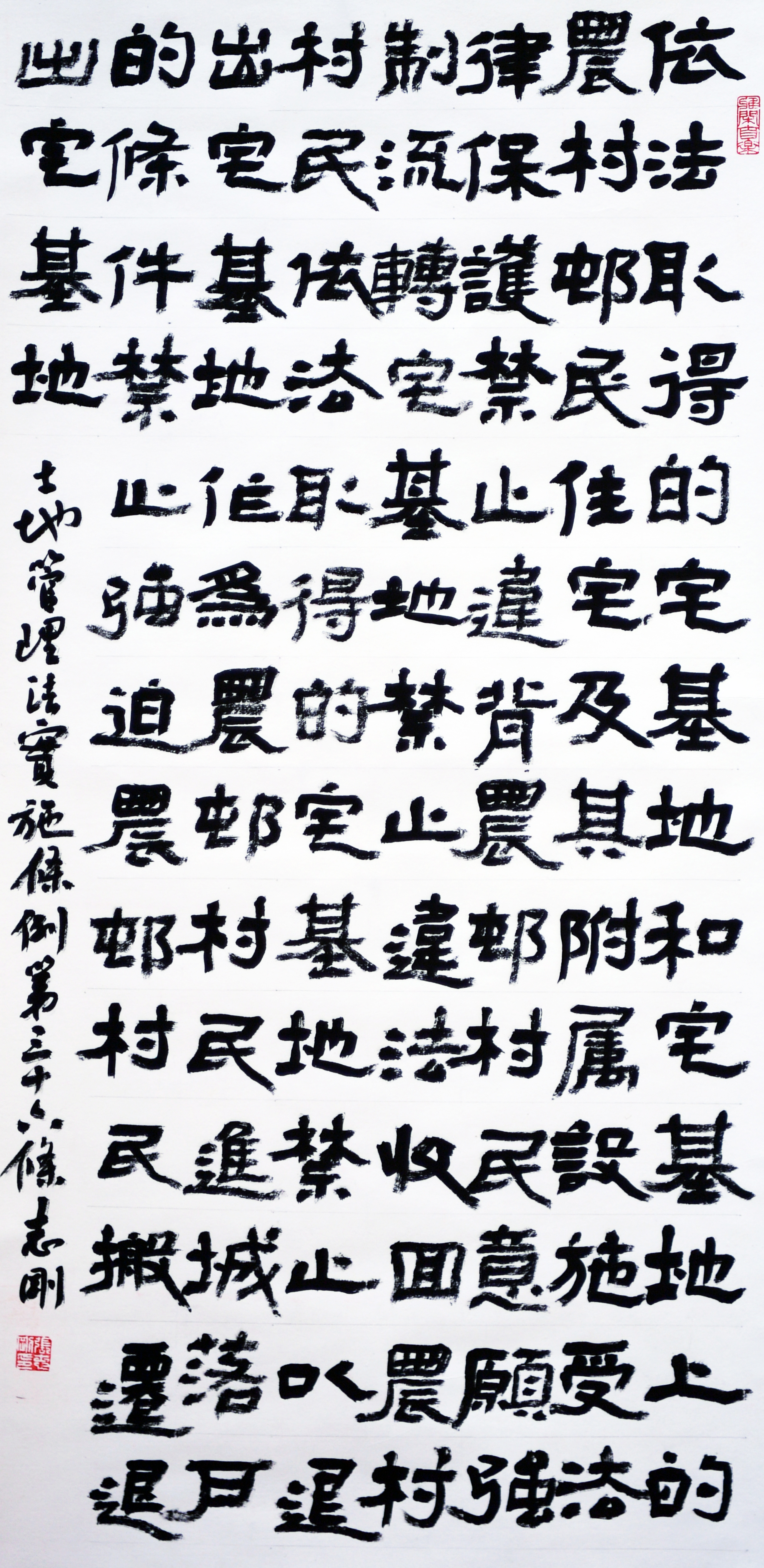 繼1600余位書法家參與書寫《中華人民共和國民法典》全部1260條法條之后,法治日報社聯(lián)合自然資源部法規(guī)司、自然資源部書畫研究會和北京昌平書法家協(xié)會,將筆端對準土地管理“一法一條例”,即《中華人民共和國土地管理法》和《中華人民共和國土地管理法實施條例》。