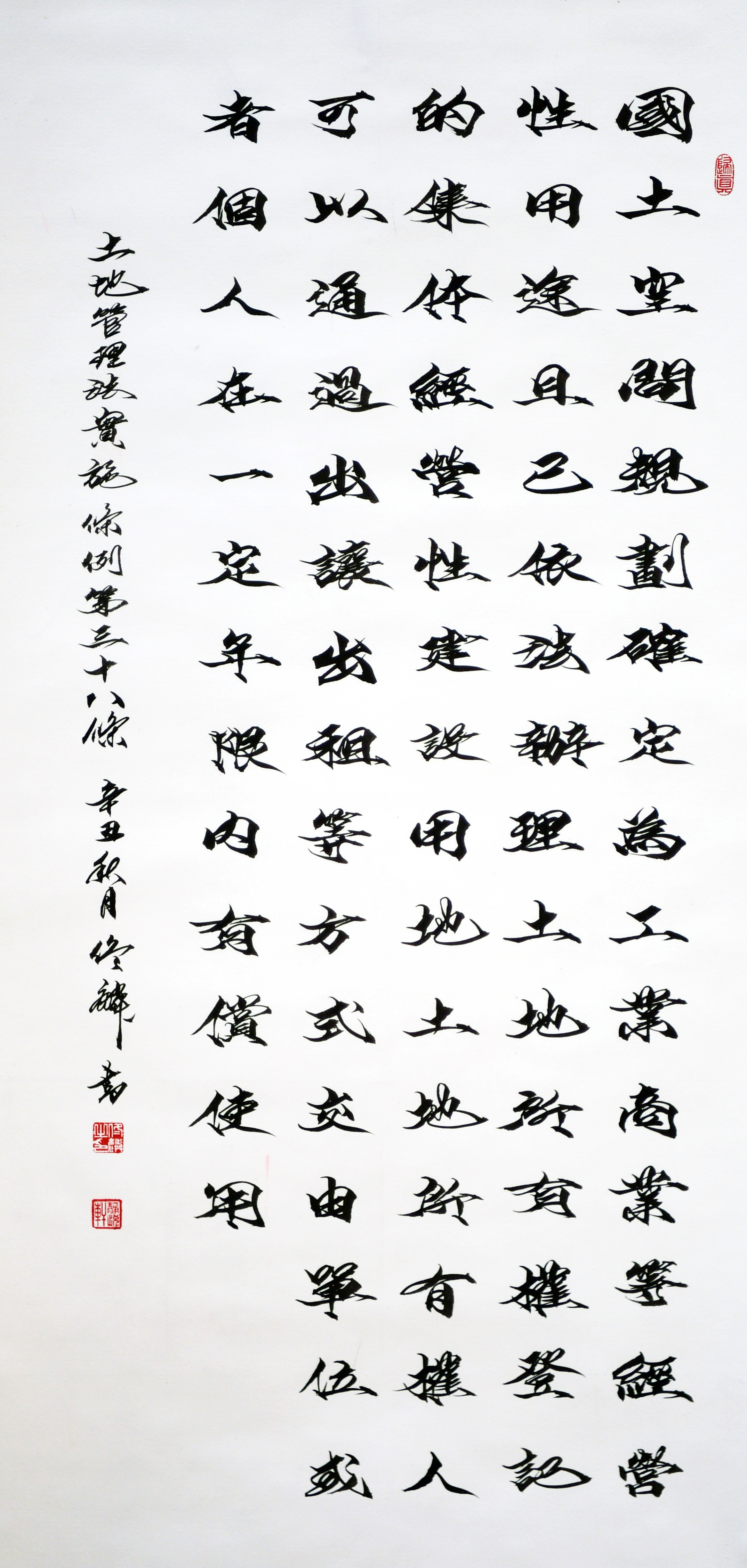 繼1600余位書法家參與書寫《中華人民共和國民法典》全部1260條法條之后,法治日報社聯(lián)合自然資源部法規(guī)司、自然資源部書畫研究會和北京昌平書法家協(xié)會,將筆端對準土地管理“一法一條例”,即《中華人民共和國土地管理法》和《中華人民共和國土地管理法實施條例》。