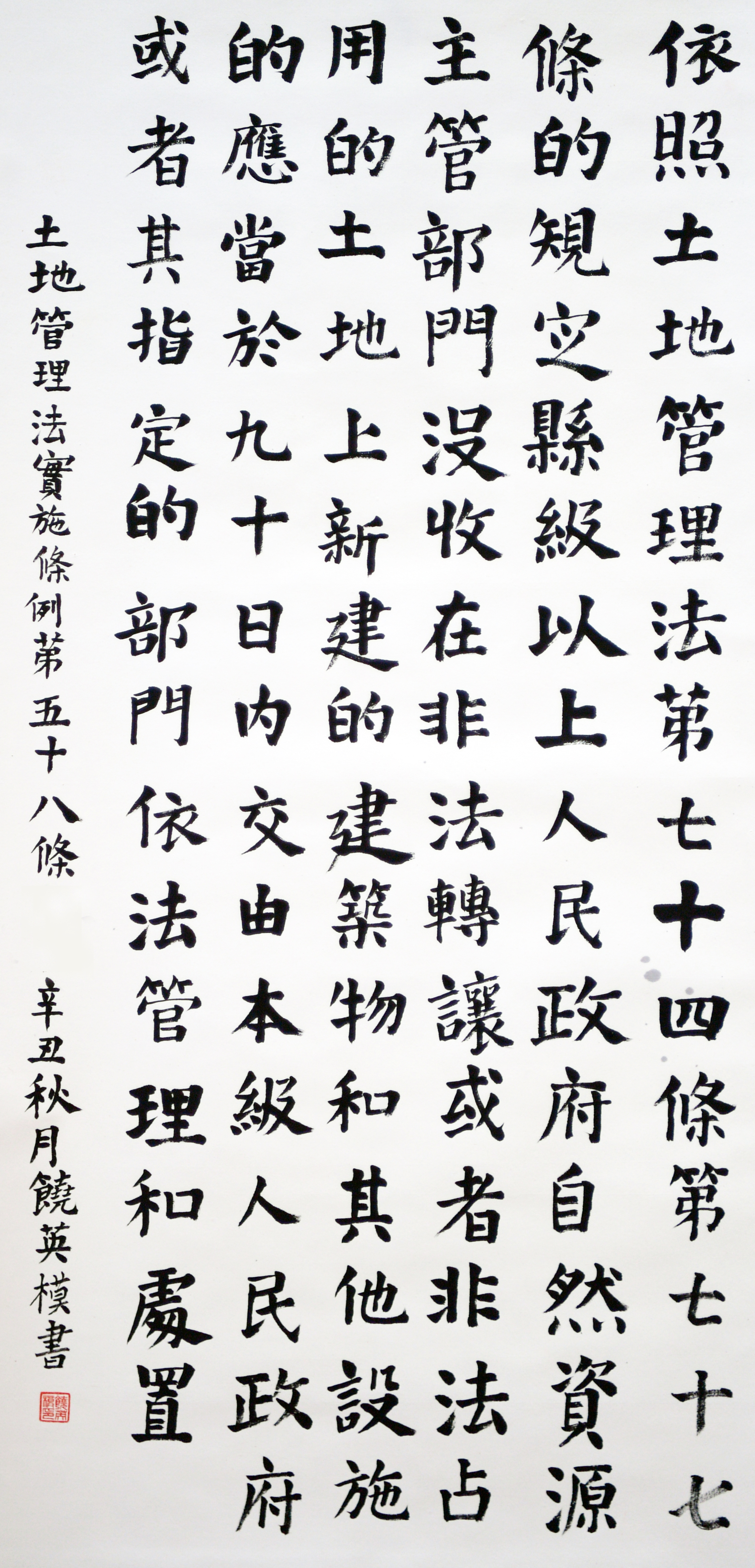 繼1600余位書法家參與書寫《中華人民共和國民法典》全部1260條法條之后,法治日報(bào)社聯(lián)合自然資源部法規(guī)司、自然資源部書畫研究會(huì)和北京昌平書法家協(xié)會(huì),將筆端對準(zhǔn)土地管理“一法一條例”,即《中華人民共和國土地管理法》和《中華人民共和國土地管理法實(shí)施條例》。