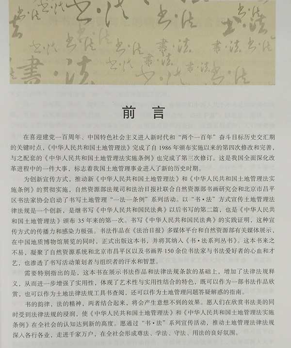 書以馭字,法以興邦;書法一體,墨法同彰。本書既可以作為一部書法作品欣賞,也可以作為土地法律法規(guī)工具書查閱,還可以作為土地管理問題答疑解惑的指南。希望這套叢書可以讓讀者在欣賞書法美的同時受到法律法規(guī)的浸潤,推動土地管理法律法規(guī)深入各行各業(yè)、走進(jìn)千家萬戶,在全社會形成尊法、學(xué)法、守法、用法的良好氛圍。