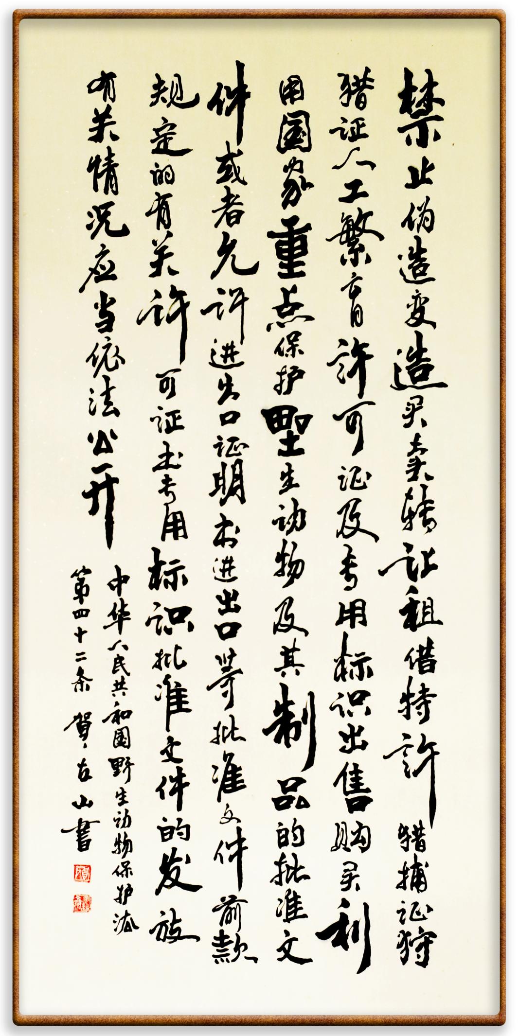 野生動物保護法第四十二條 禁止偽造、變造、買賣、轉讓、租借特許獵捕證、狩獵證、人工繁育許可證及專用標識,出售、購買、利用國家重點保護野生動物及其制品的批準文件,或者允許進出口證明書、進出口等批準文件。