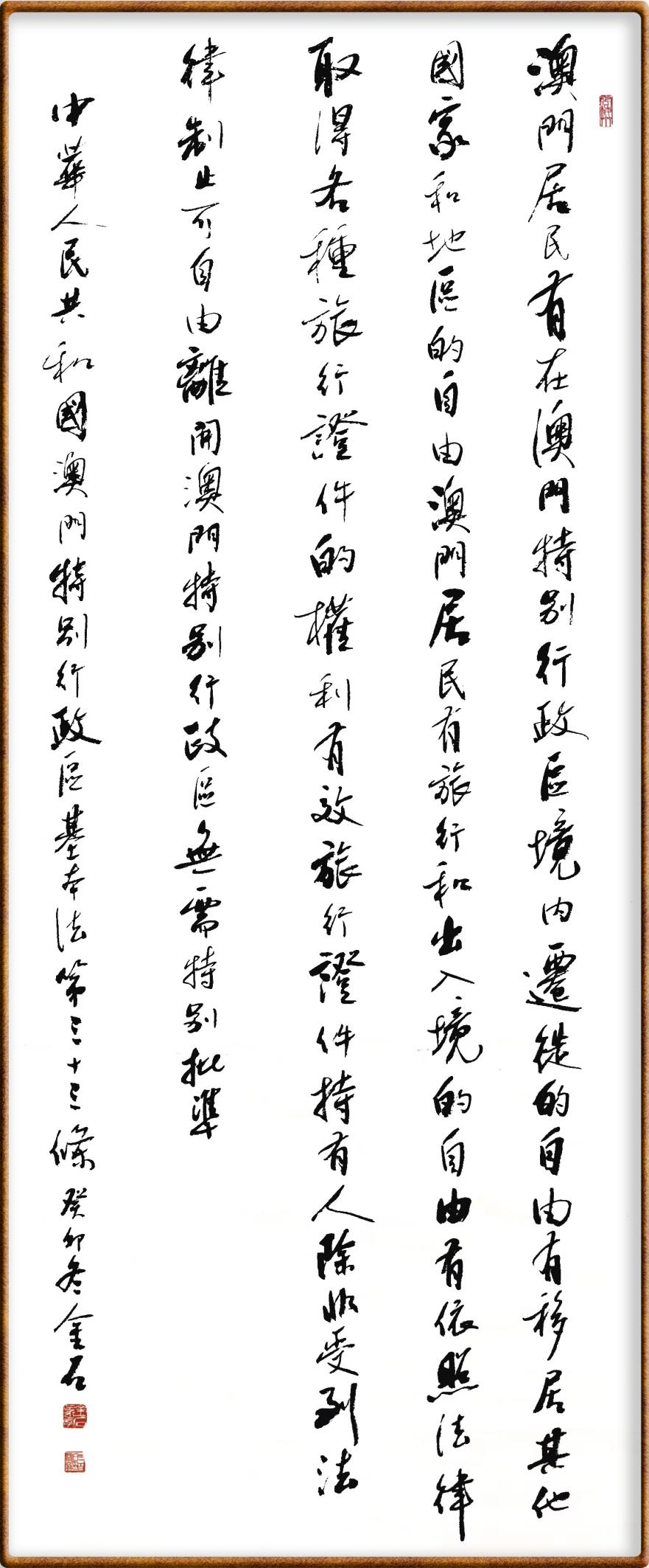 澳門基本法第三十三條 澳門居民有在澳門特別行政區(qū)境內(nèi)遷徙的自由,有移居其他國家和地區(qū)的自由。澳門居民有旅行和出入境的自由,有依照法律取得各種旅行證件的權(quán)利。有效旅行證件持有人,除非受到法律制止,可自由離開澳門特別行政區(qū),無需特別批準(zhǔn)。